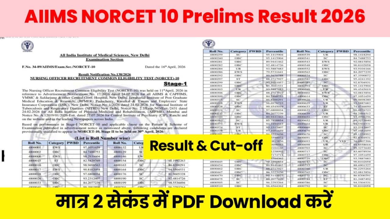 Good news for all nursing aspirants! The All India Institute of Medical Sciences (AIIMS), New Delhi has officially declared the AIIMS NORCET 10 Prelims Result 2026 today, April 16, 2026 at its official website aiimsexams.ac.in. The Stage 1 (Prelims) CBT exam was conducted on April 11, 2026, and candidates who have cleared this stage are now eligible to appear for the Mains exam scheduled on April 30, 2026. If you appeared for the exam, head over to aiimsexams.ac.in right now and check whether your roll number is in the qualified list.
